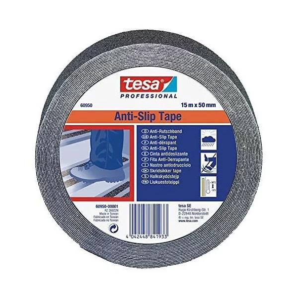 Tesa 60950 is an anti-slip safety tape (self-adhesive) that has a wide range of possible applications. It comprises a PVC substrate coated with mineral particles and is often used for fall prevention on stair treads and all slippery floors that are prone to accidents.